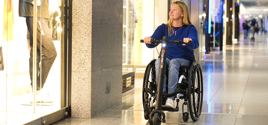 - Produkte wie R90, M90 und WheelDrive sind ideal, da sie die Breite Ihres Rollstuhls nicht vergrößern und so die Manövrierfähigkeit erhalten.